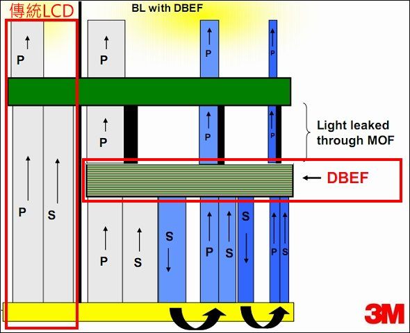 一方反射型偏光フィルムであるDBEFは光の干渉を利用し、偏光板を通過しないS波をリサイクルし、光を通過するP波に変換させる技術である。結果として視野角を落とすことなく、輝度向上が可能となる。